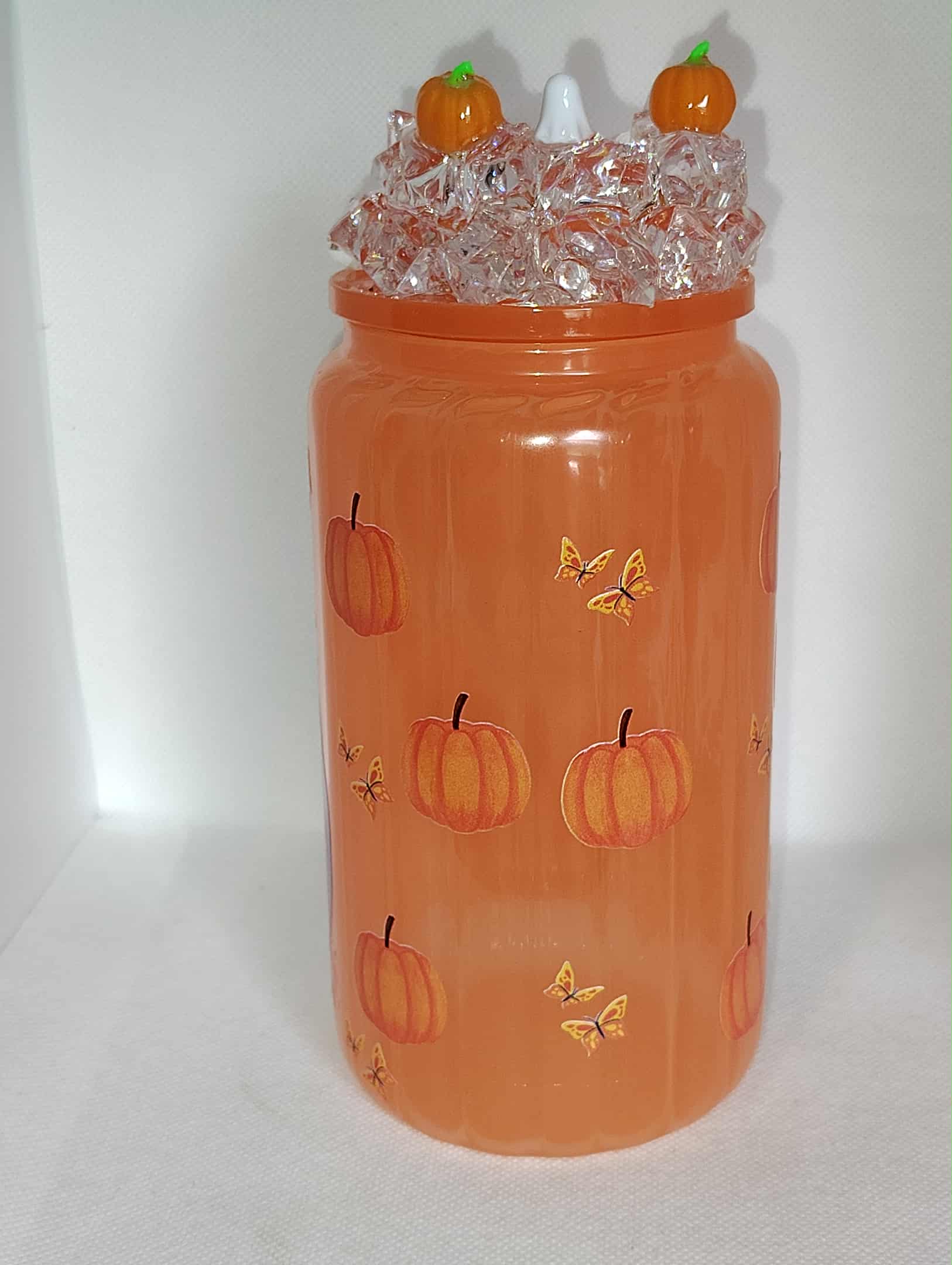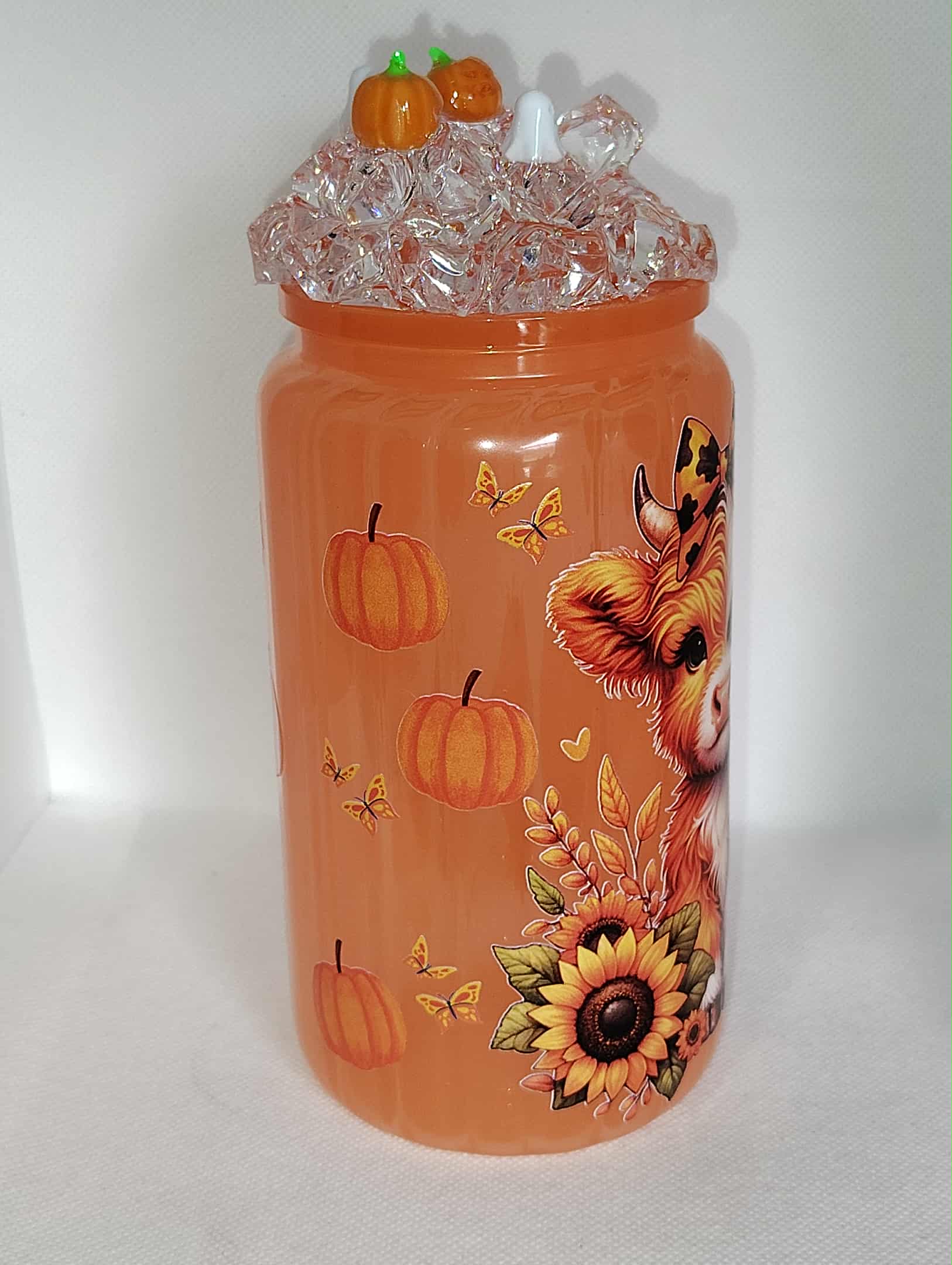 This is the most beautiful 16oz GLASS can tumbler with a cute little Halloween cow with pumpkins going around. The lid is decorated with fake ice cubes with 3d printed ghost and pumpkins.