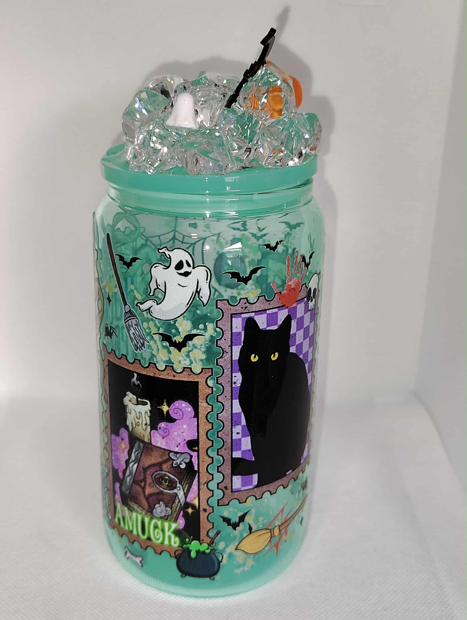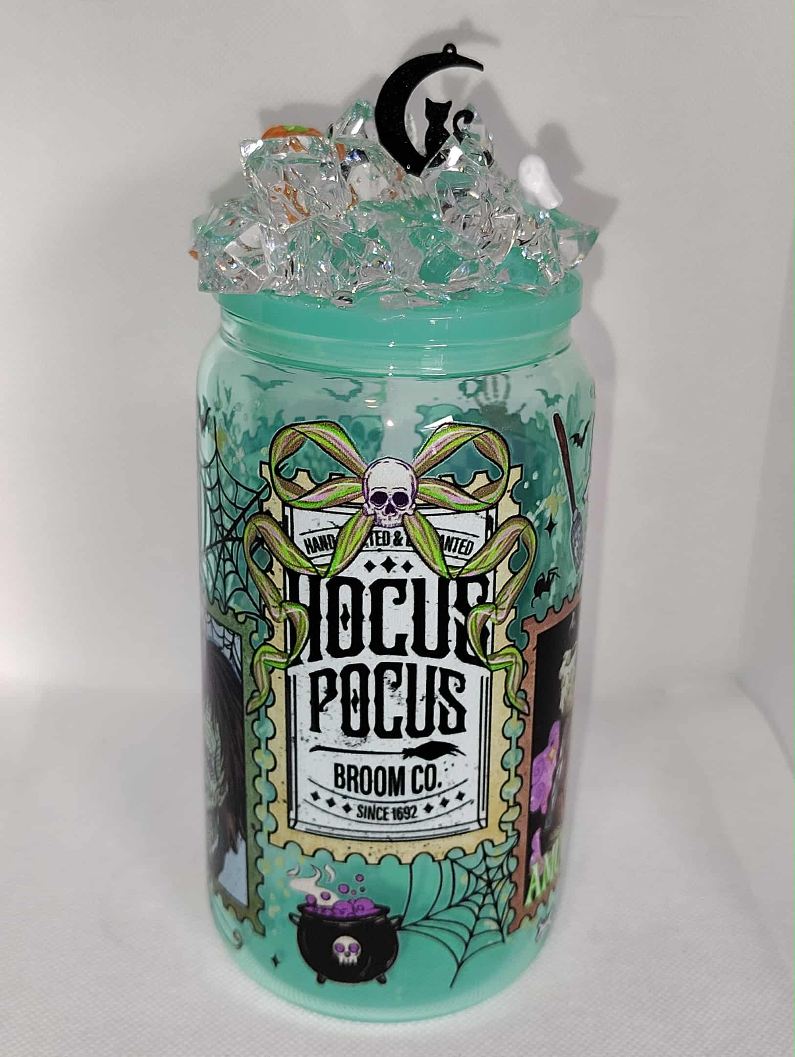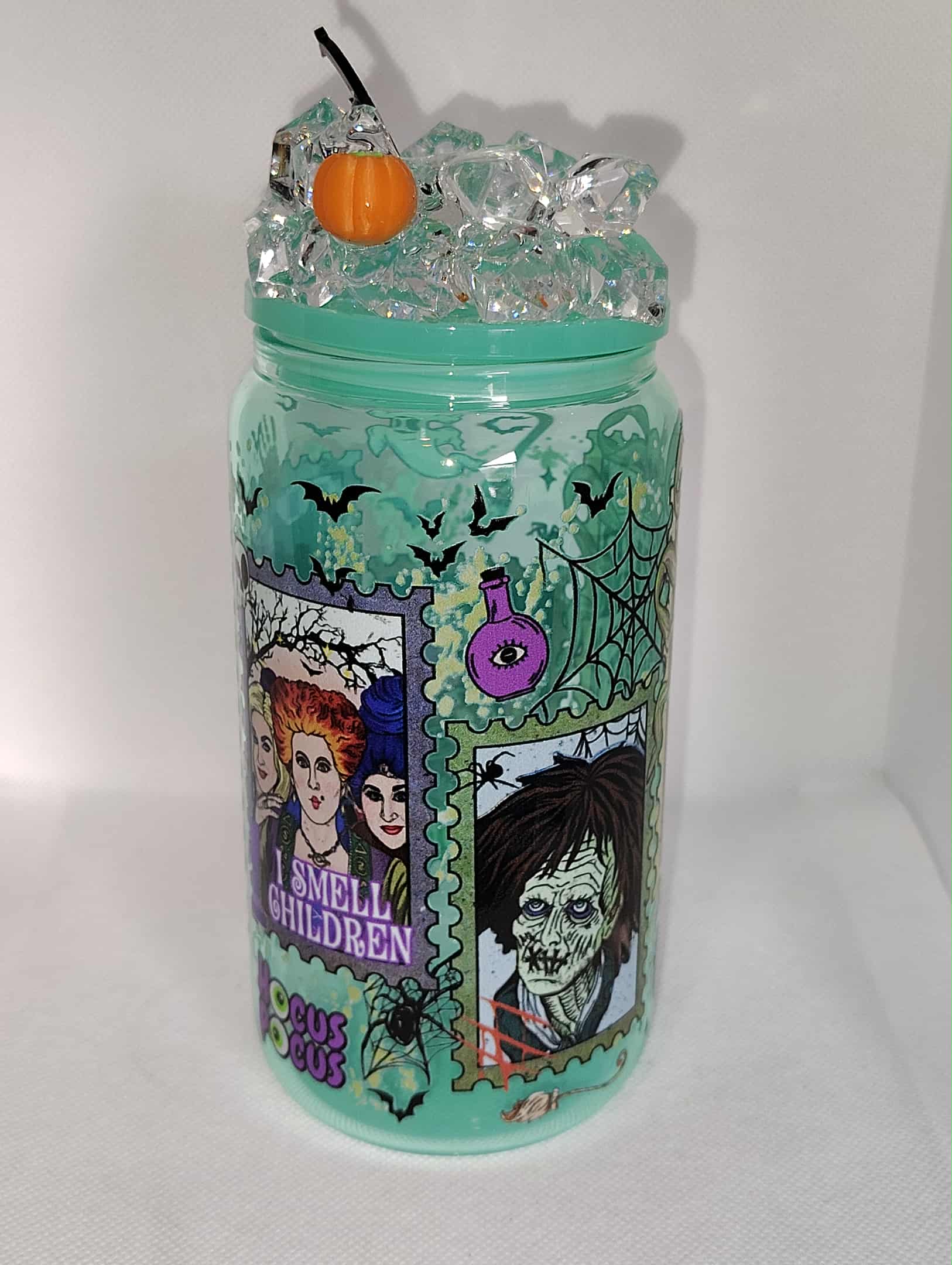 This is a beautiful light green 3 witches 16oz GLASS can tumbler. The lid is decorated with fake ice and 3d printed cat, ghost, and pumpkins.