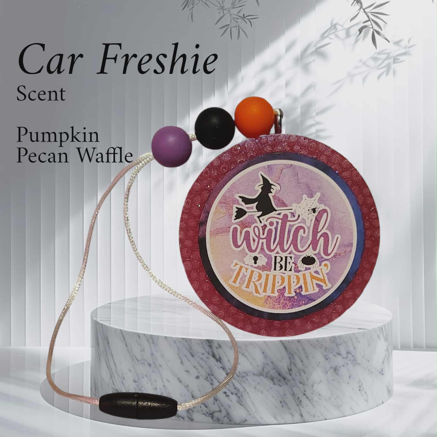 "Witches Be Trippin" purple themed round car freshie. Pumpkin Pecan Waffle scented.