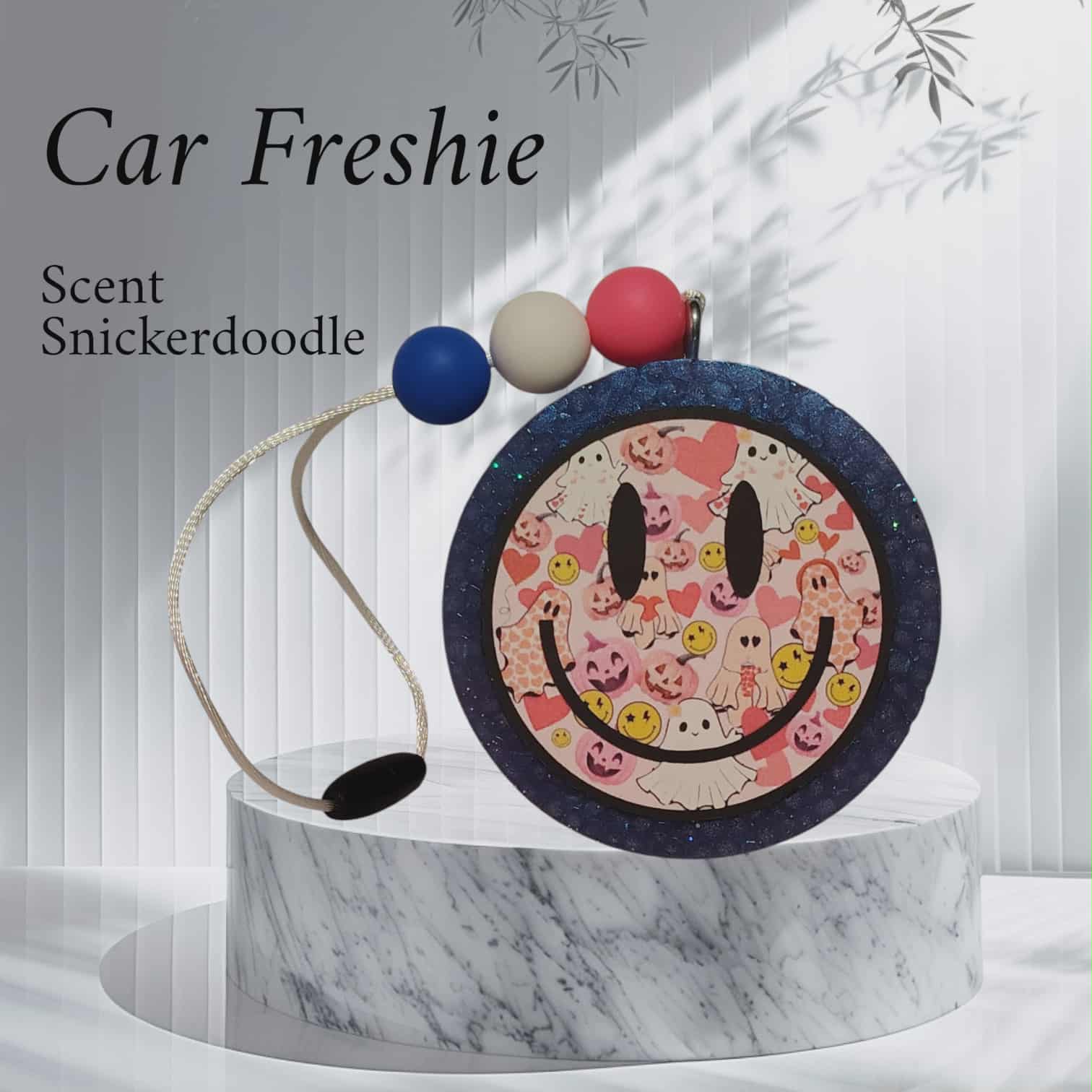 This is a blue round car freshie with a smiley face image. It comes in Snickerdoodle scent.