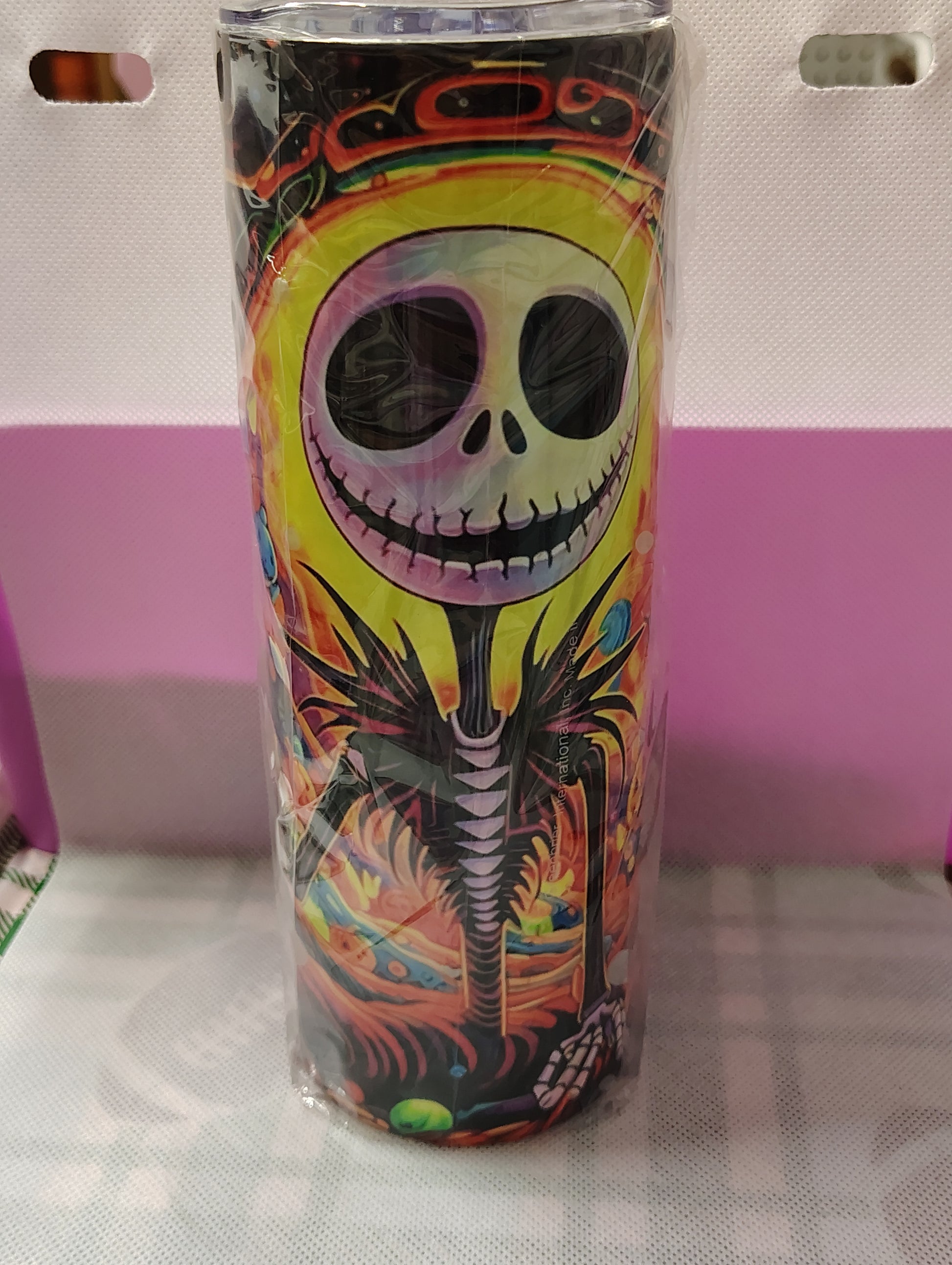 20oz insulated stainless steel tumbler with a skeleton with a big moon behind him. This is the perfect tumbler for coffee this Halloween. It can hold HOT/COLD drinks