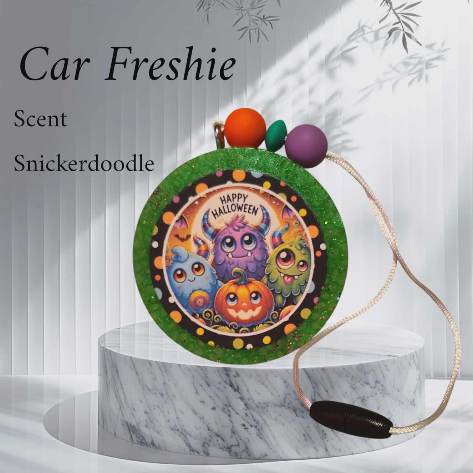 This is a candy apple green with a Happy Halloween monster image. It is Snickerdoodle scented.