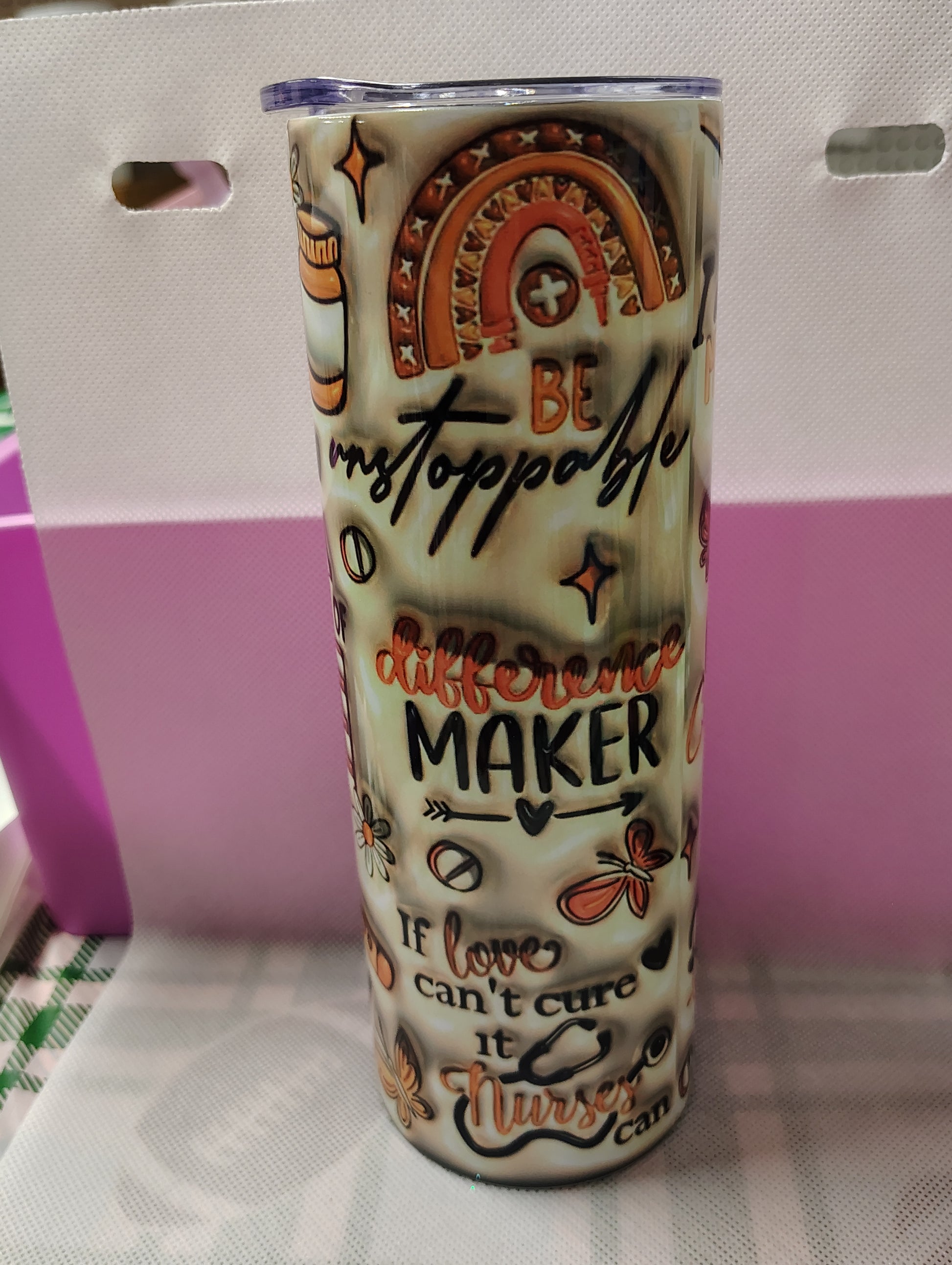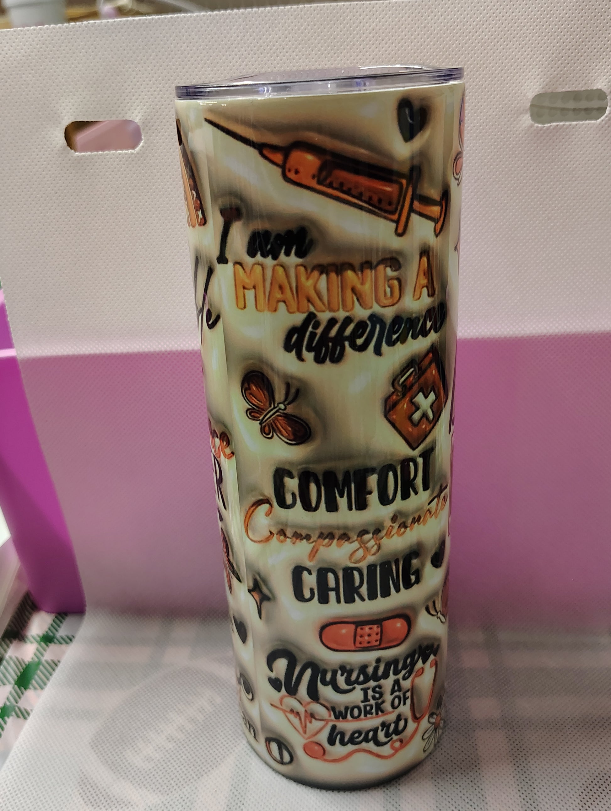 20oz insulated stainless steel tumbler. It's a Nurse Inspiration theme, displaying different sayings on it. It holds HOT/COLD drinks.