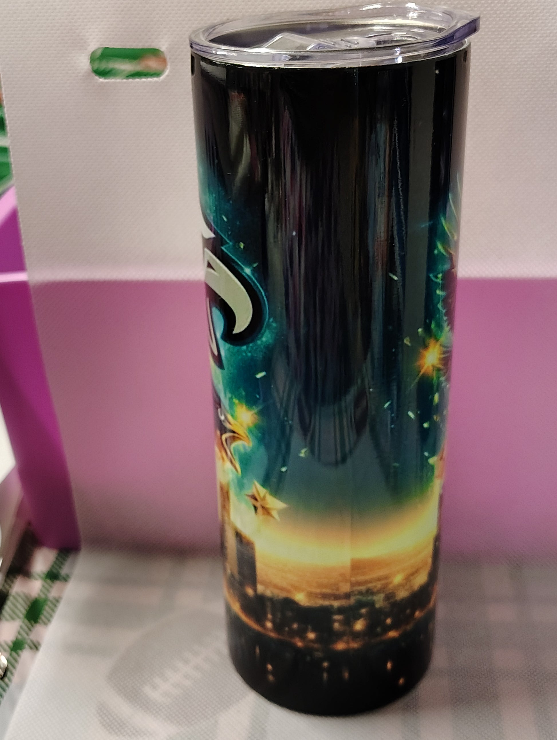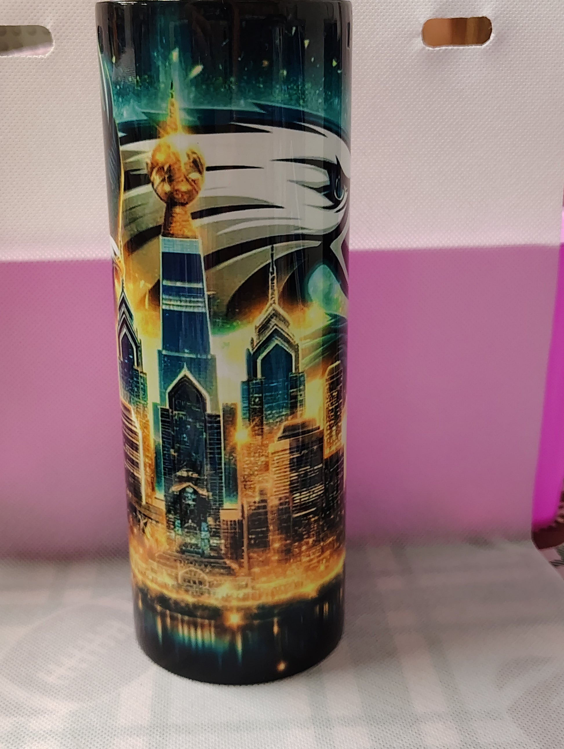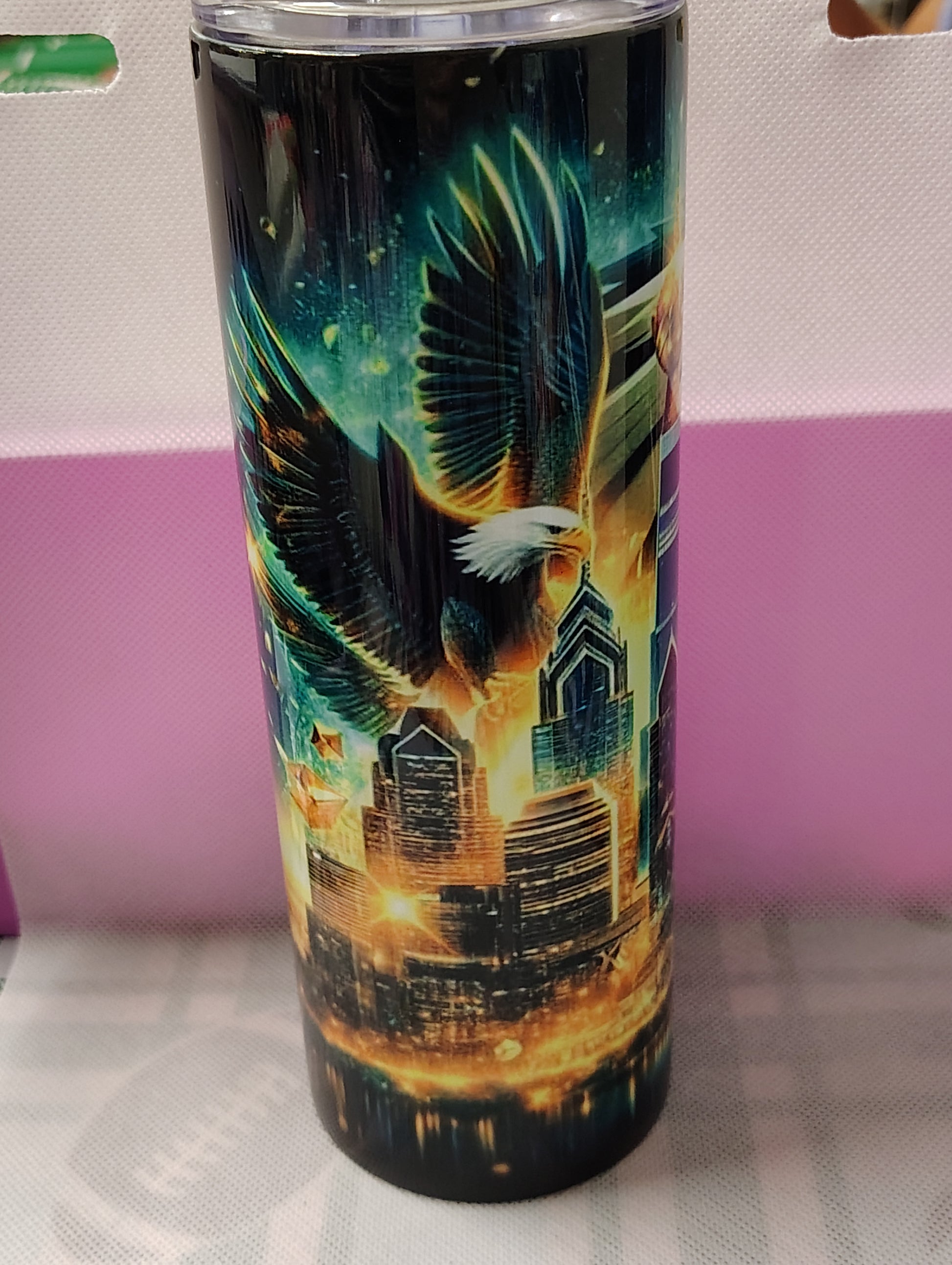 20oz insulated stainless steel tumbler with a bird in the city. Hold HOT/COLD drinks.