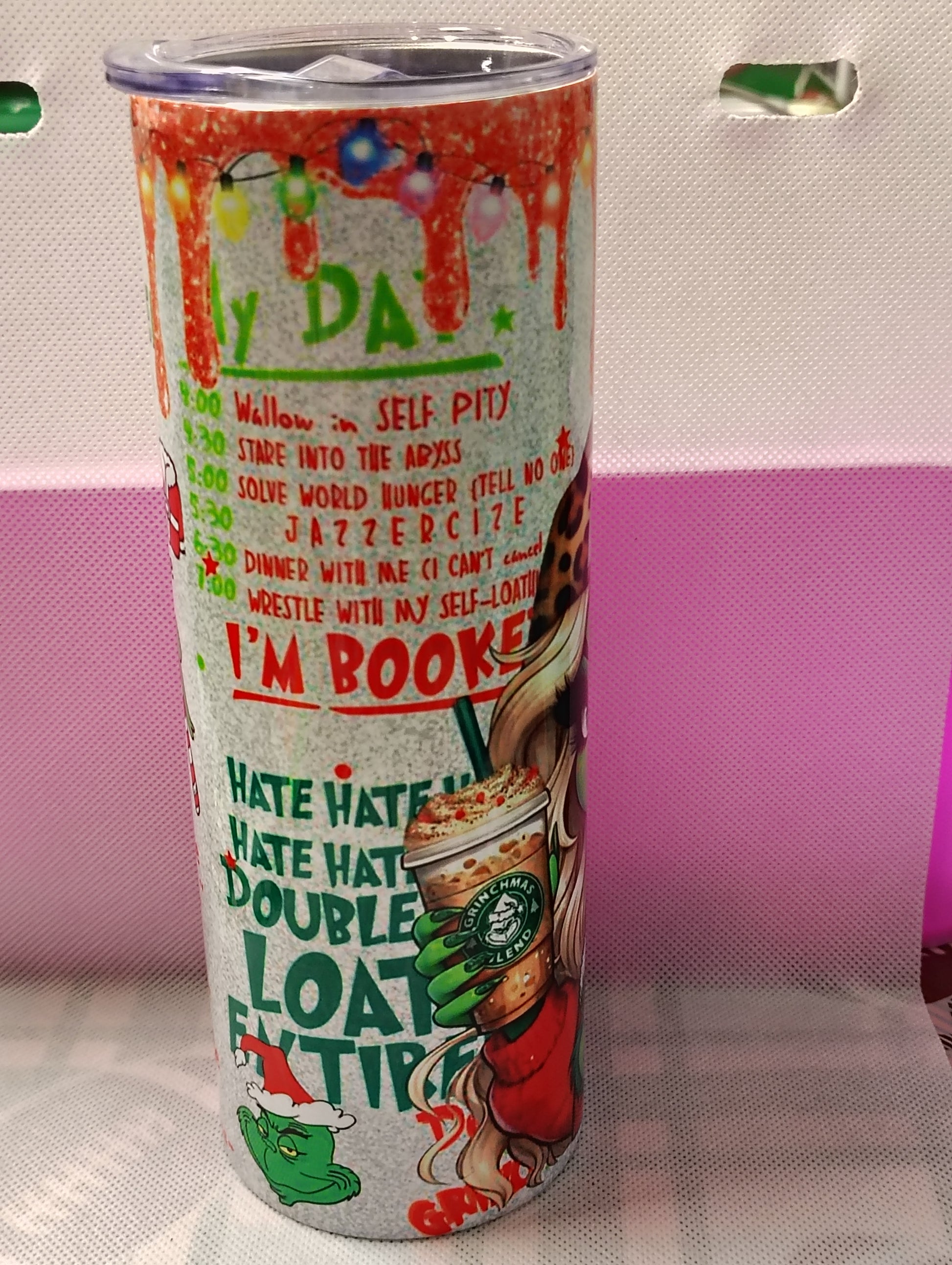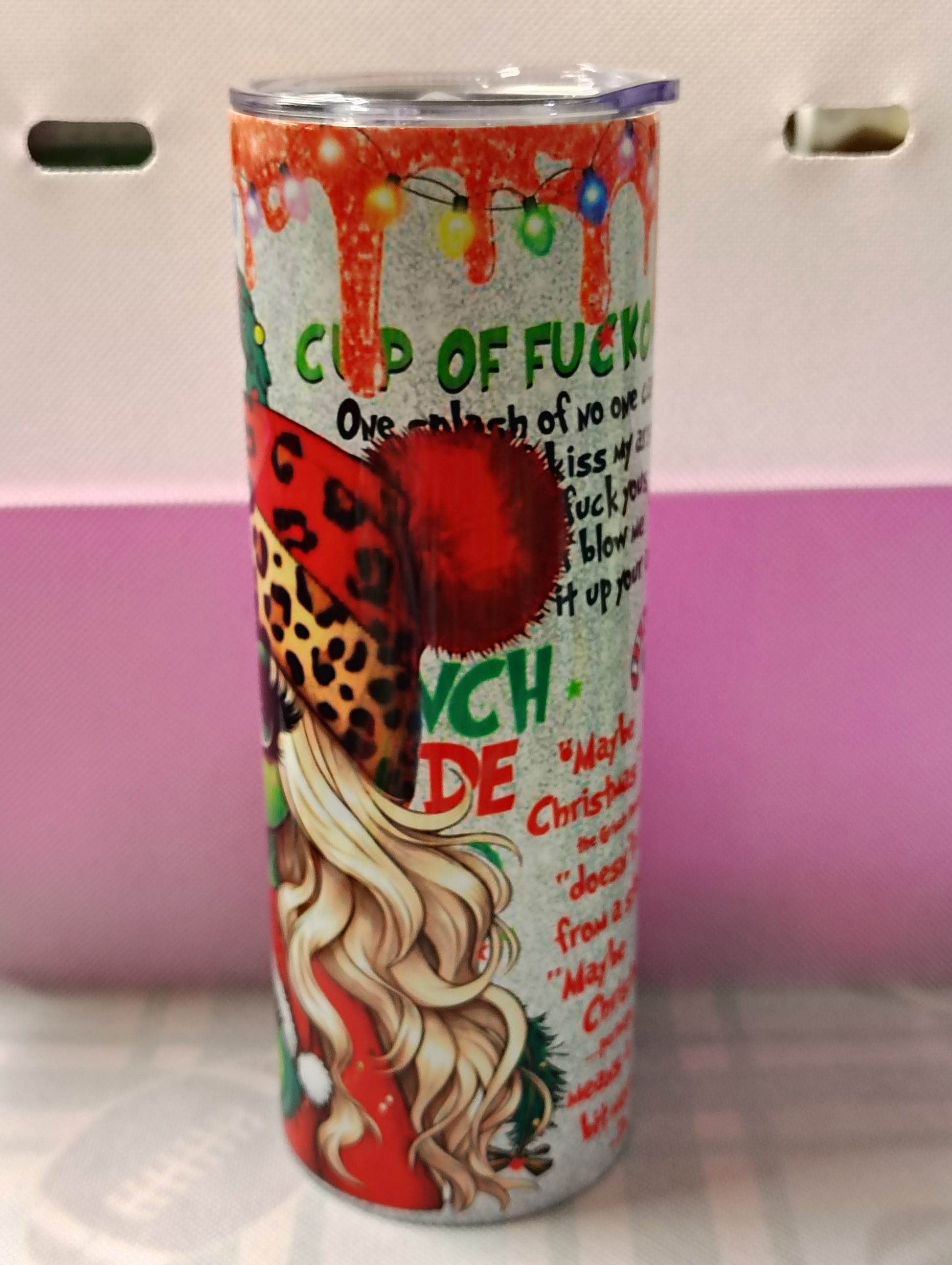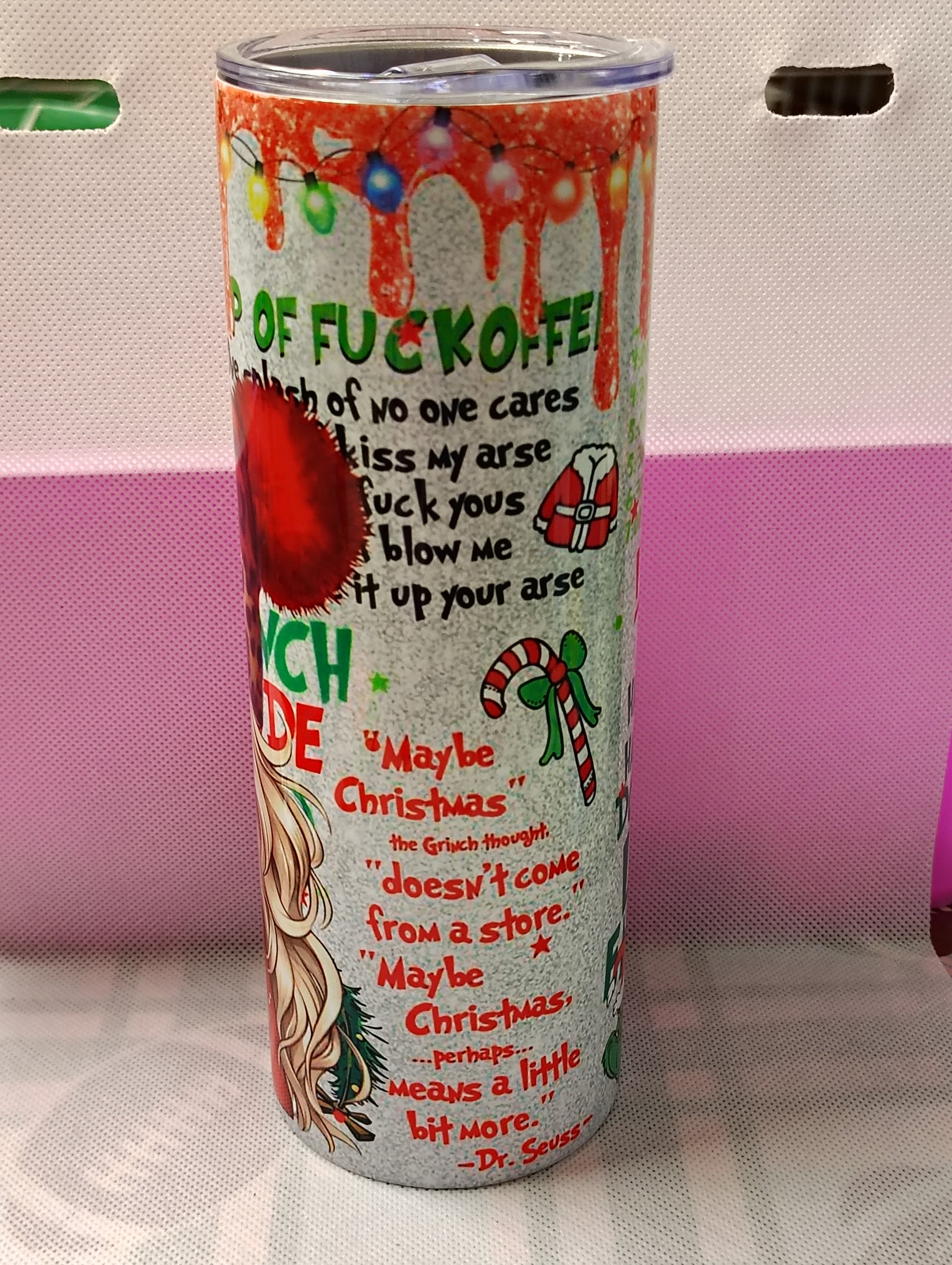 Beautiful green girl 20oz insulated stainless steel tumbler with different sayings all around. Holds HOT/COLD drinks Perfect for Christmas or all year around.