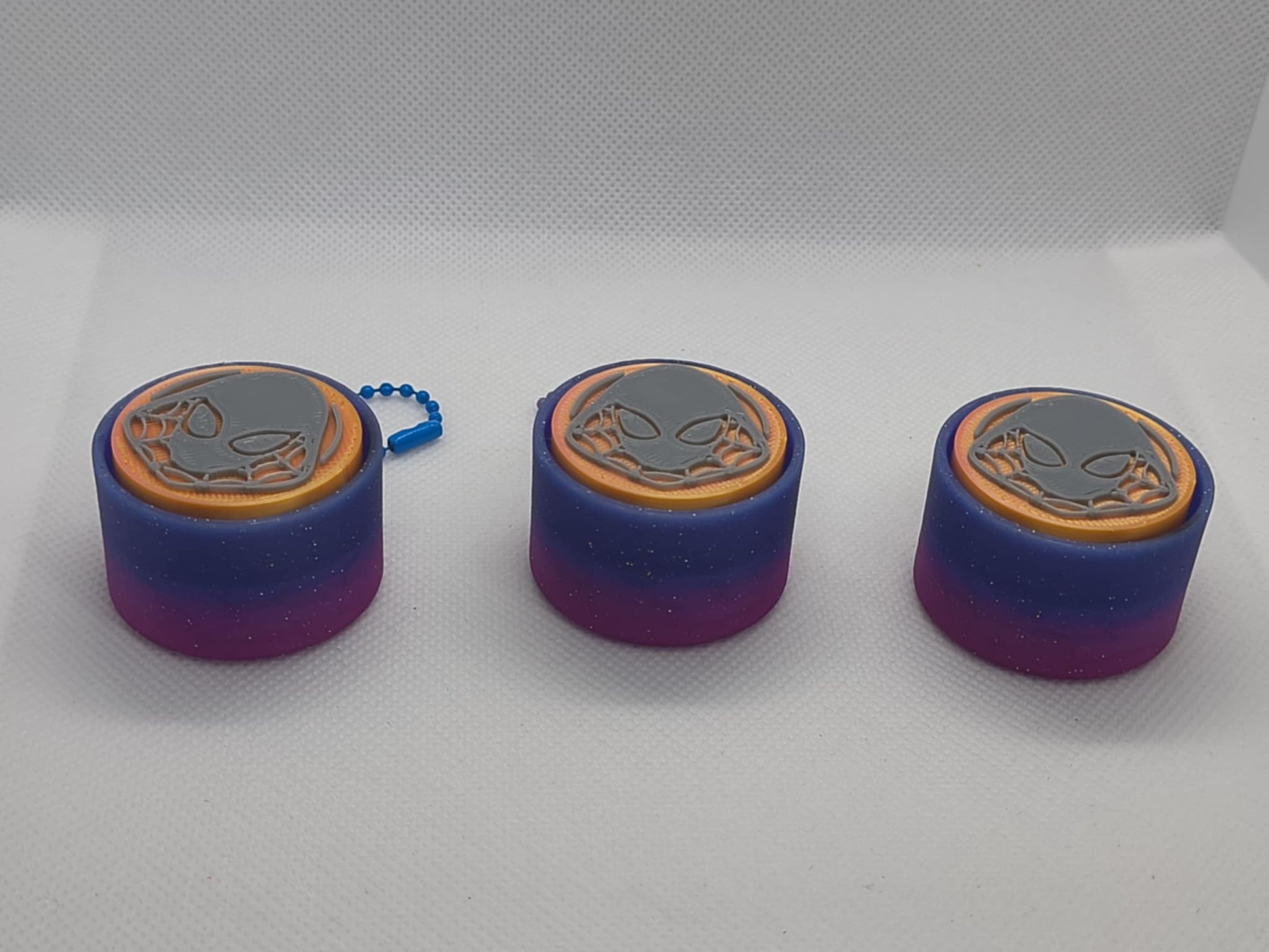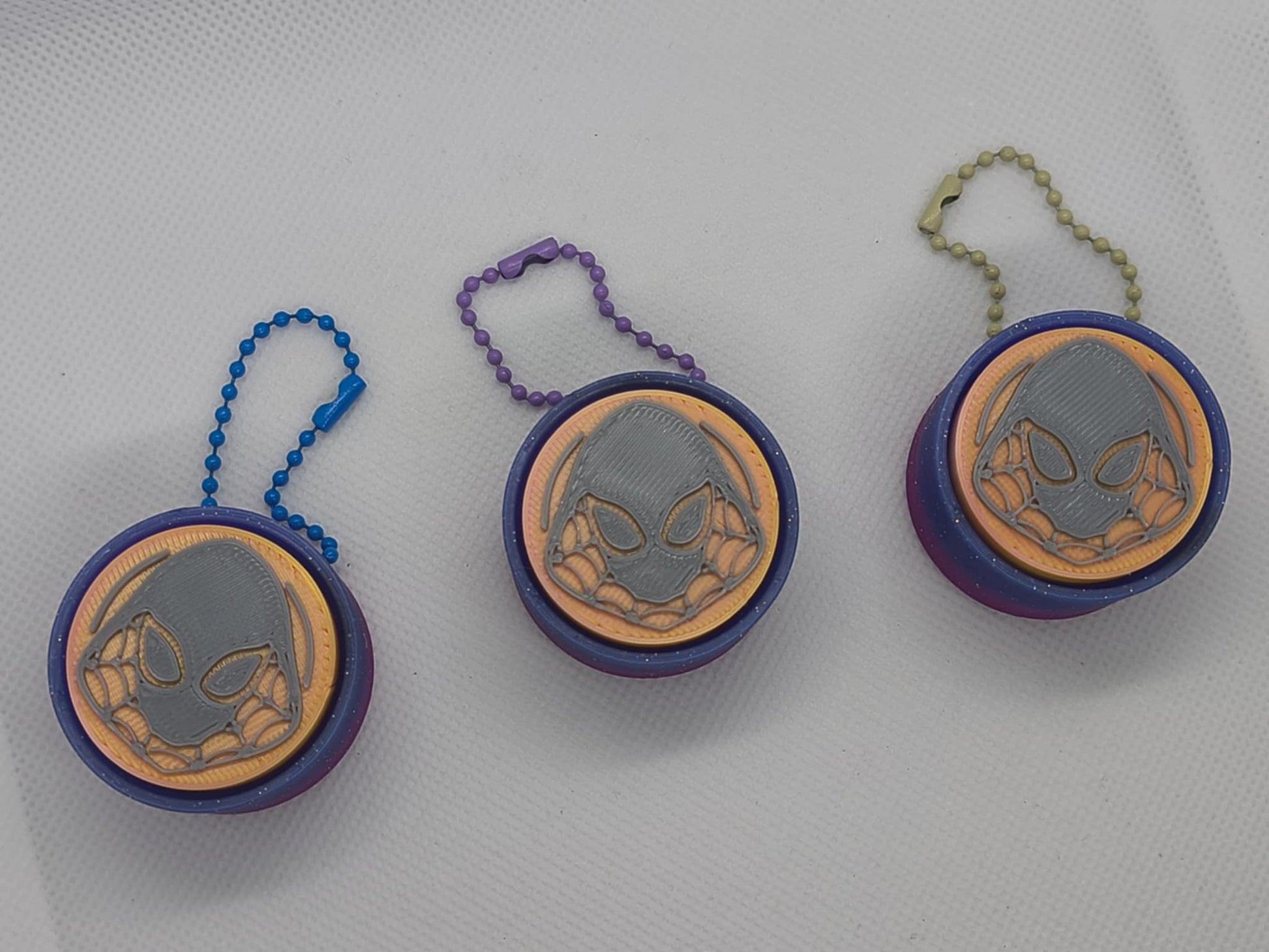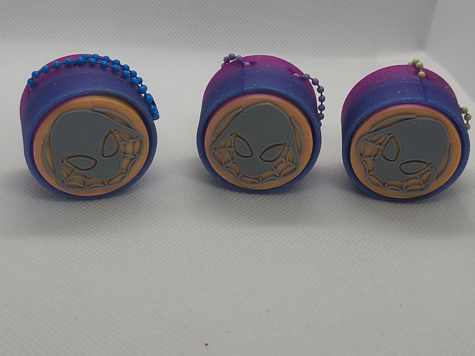 This is a Girl Spidey 3D printed Clicker. It's 1.5 inches round and 1 inch tall. It has a galaxy glitter base.