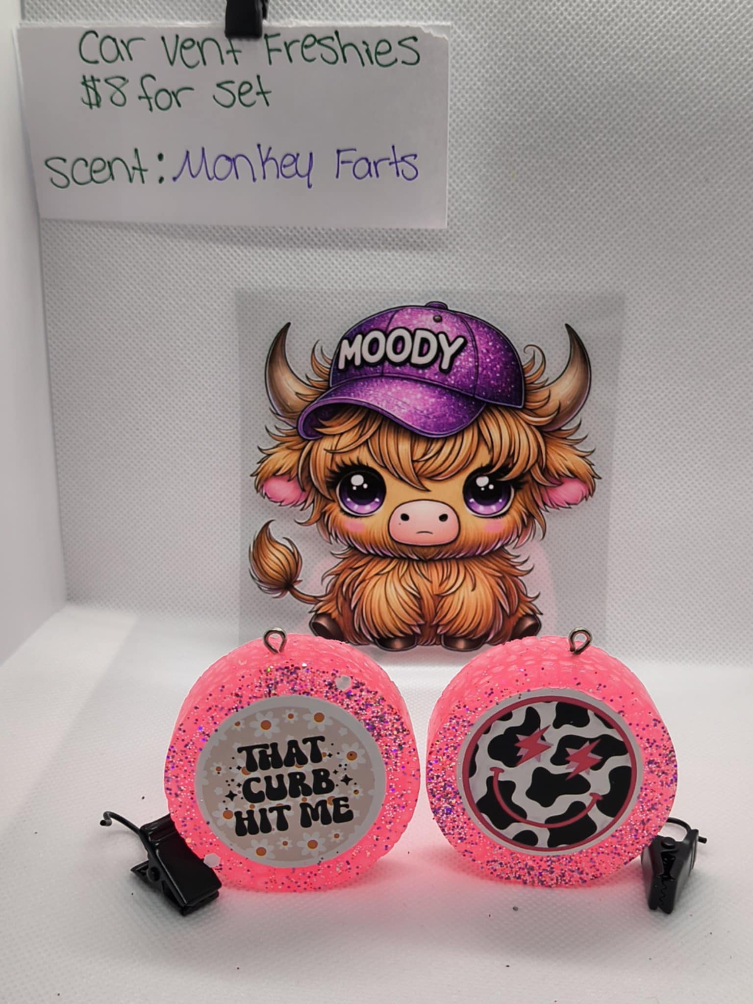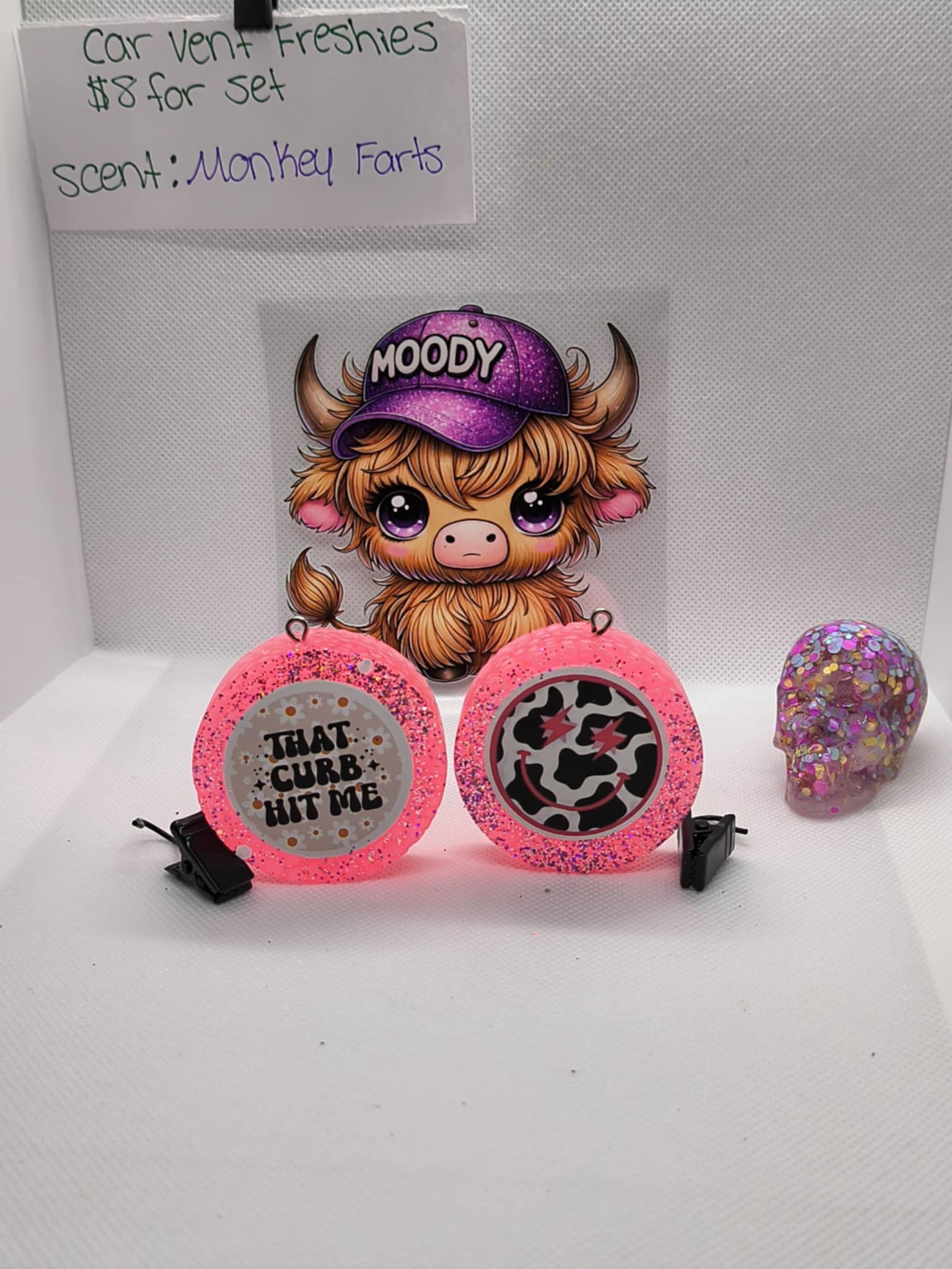 This is a set of Glittery Hot Pink round car vent freshies. One has a cow print smiley and the other says "That Curb Hit Me"