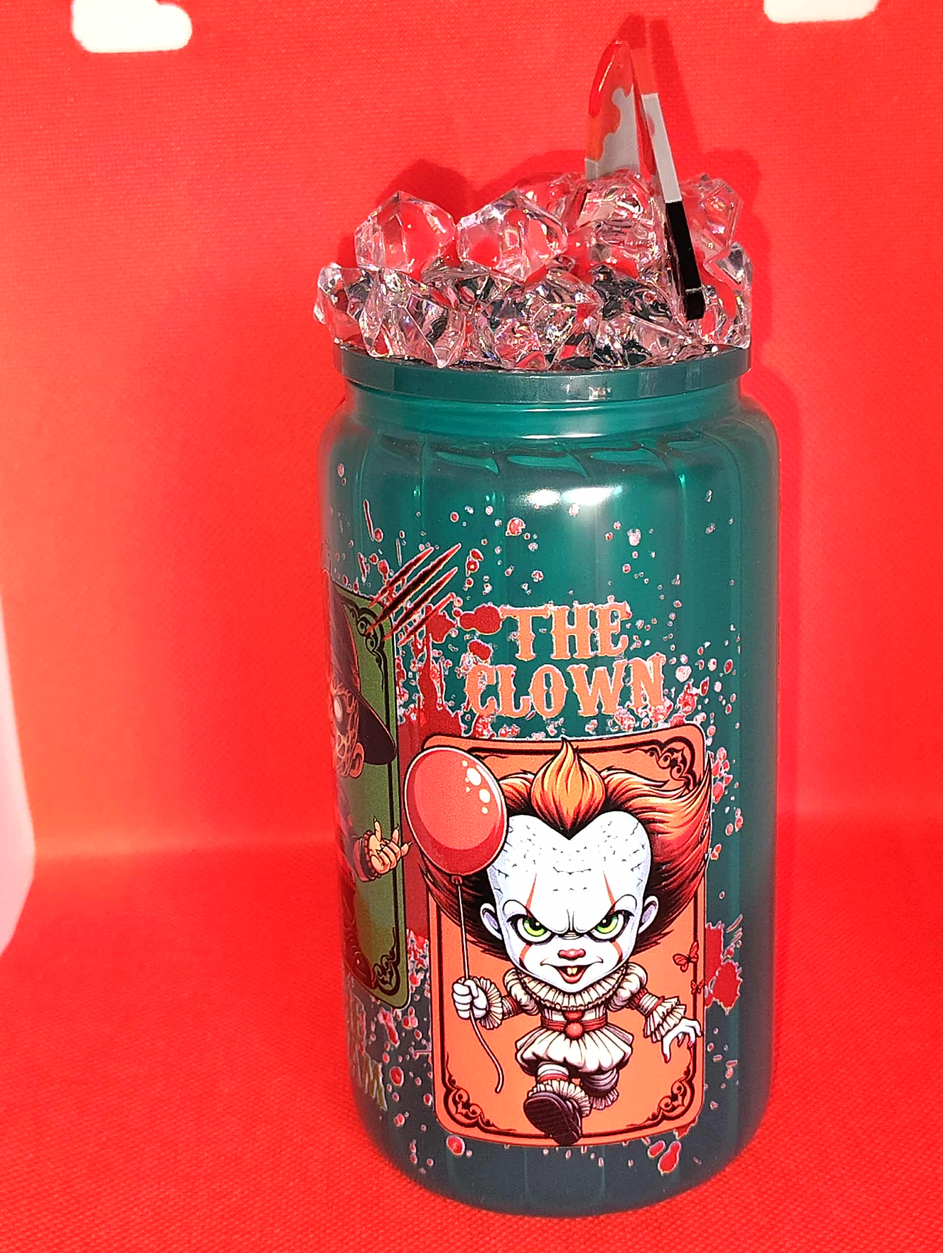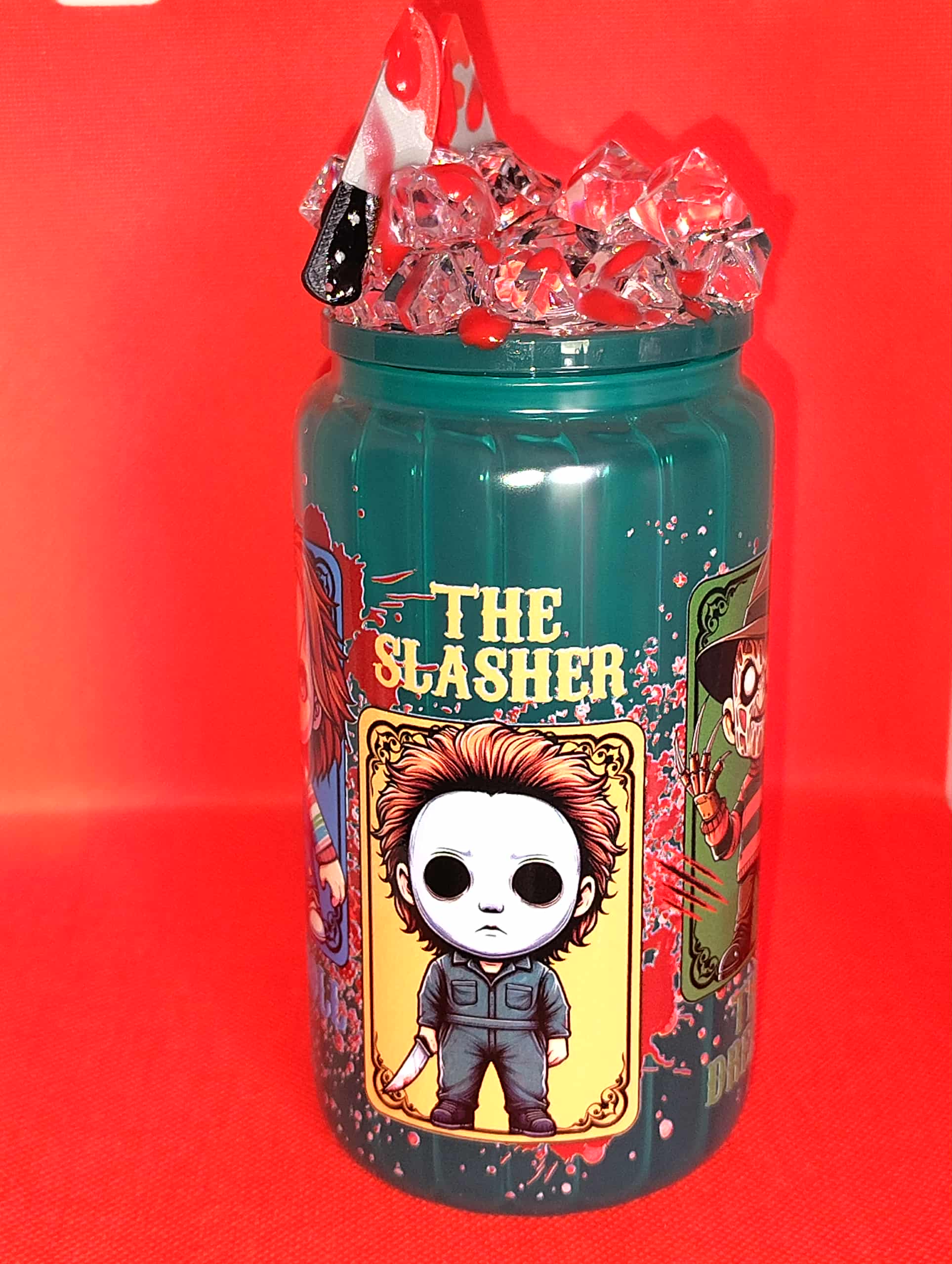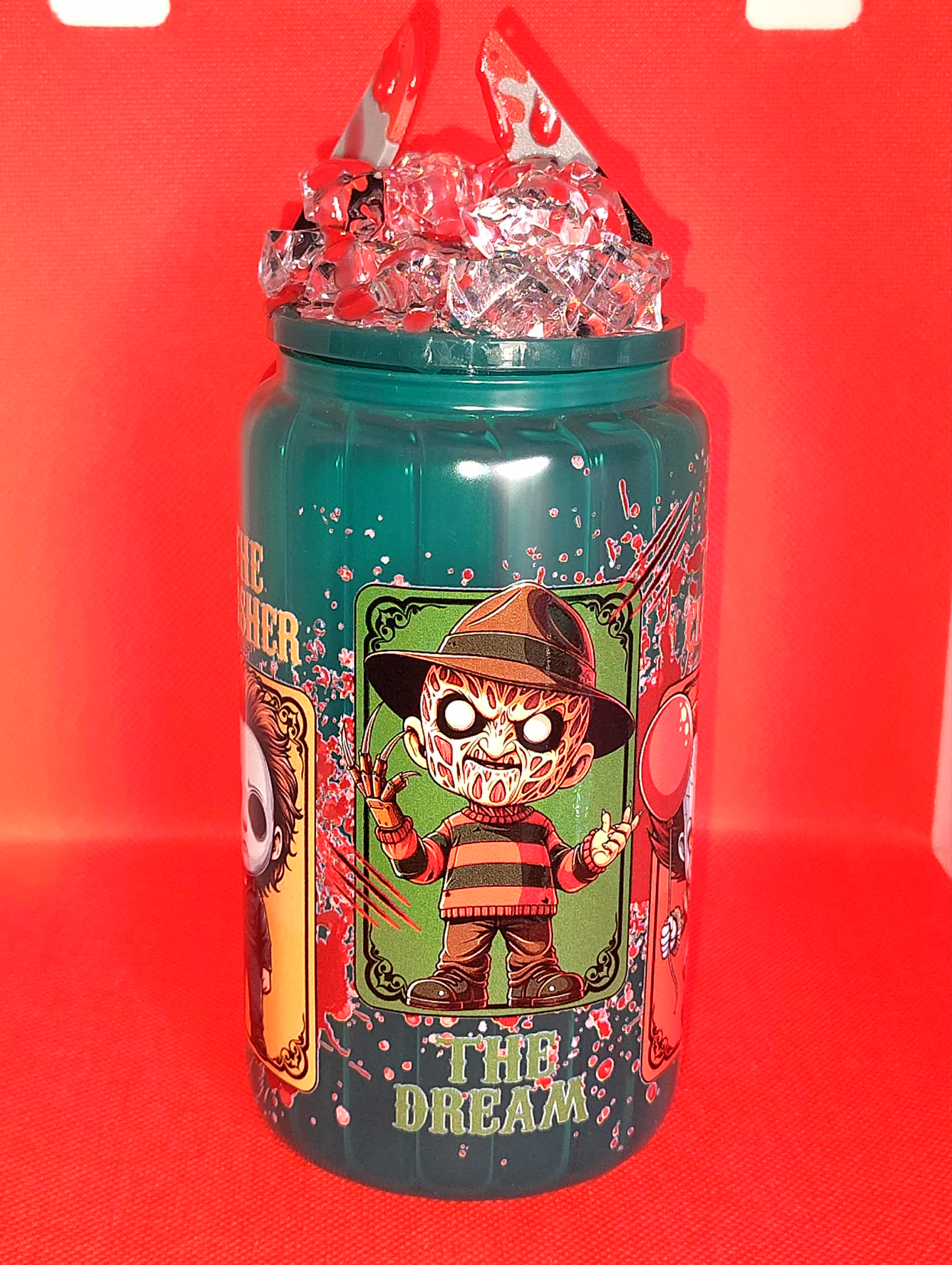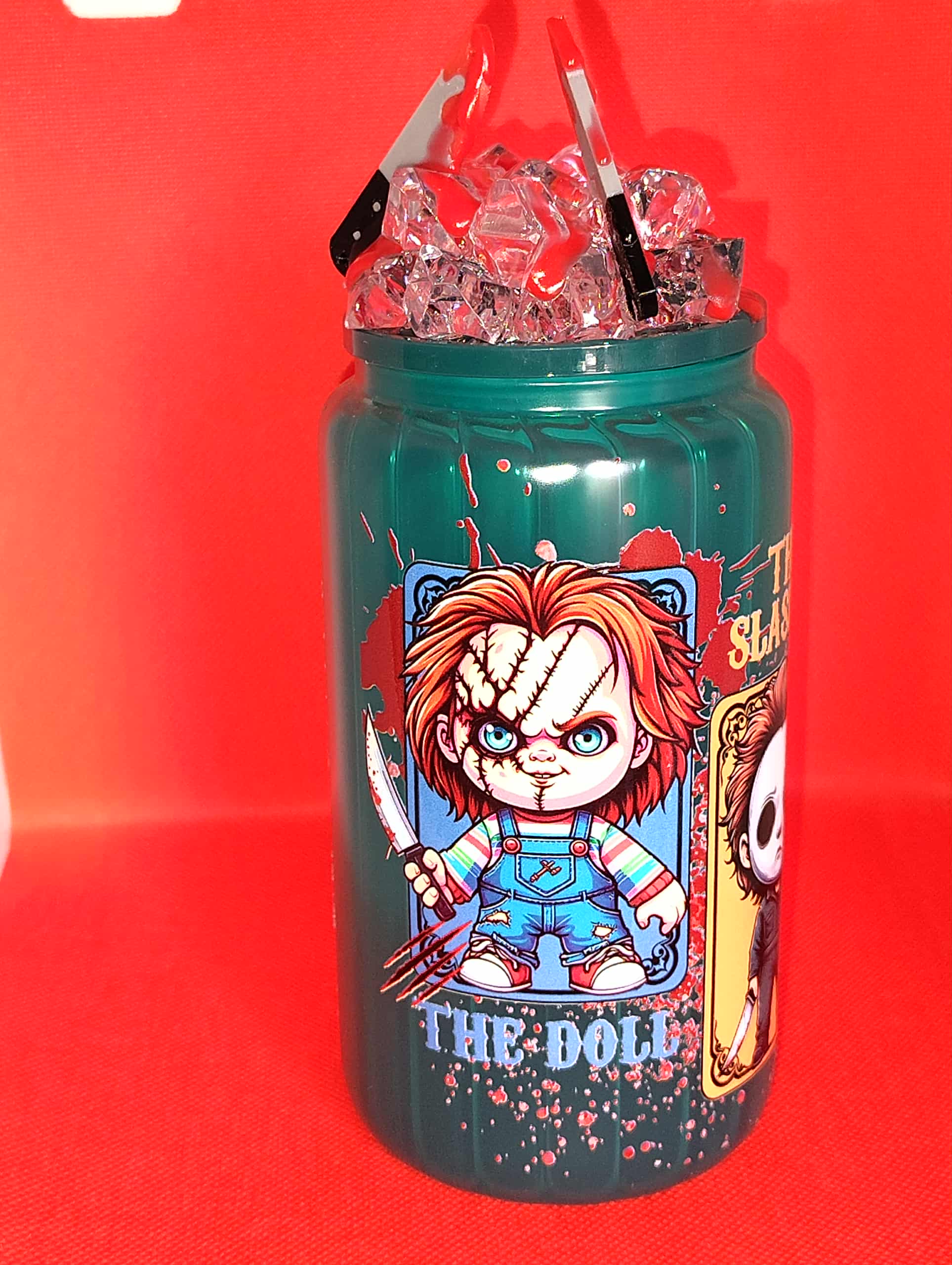 This is a 16oz dark green GLASS can tumbler with horror guys wrapped all around.