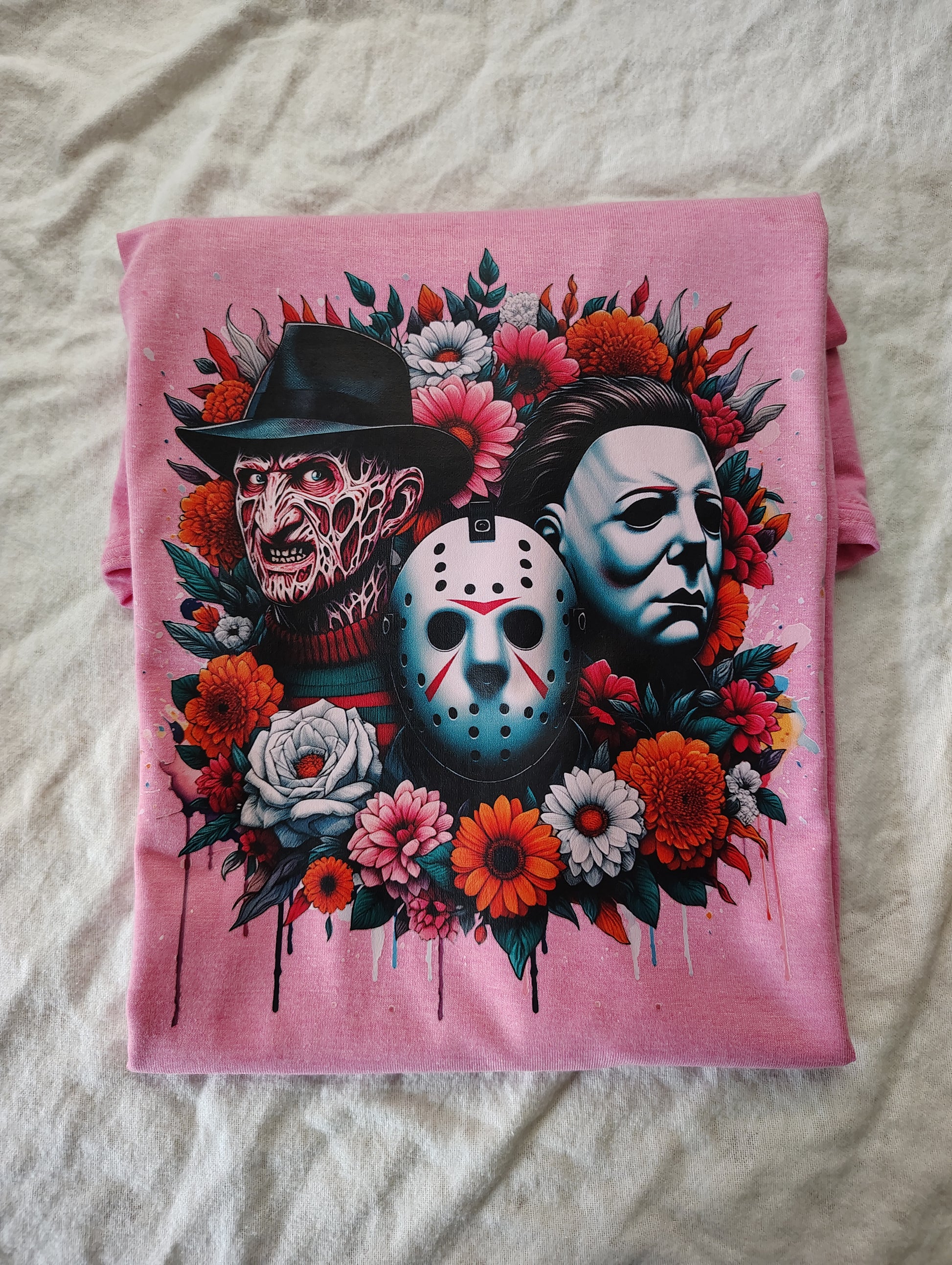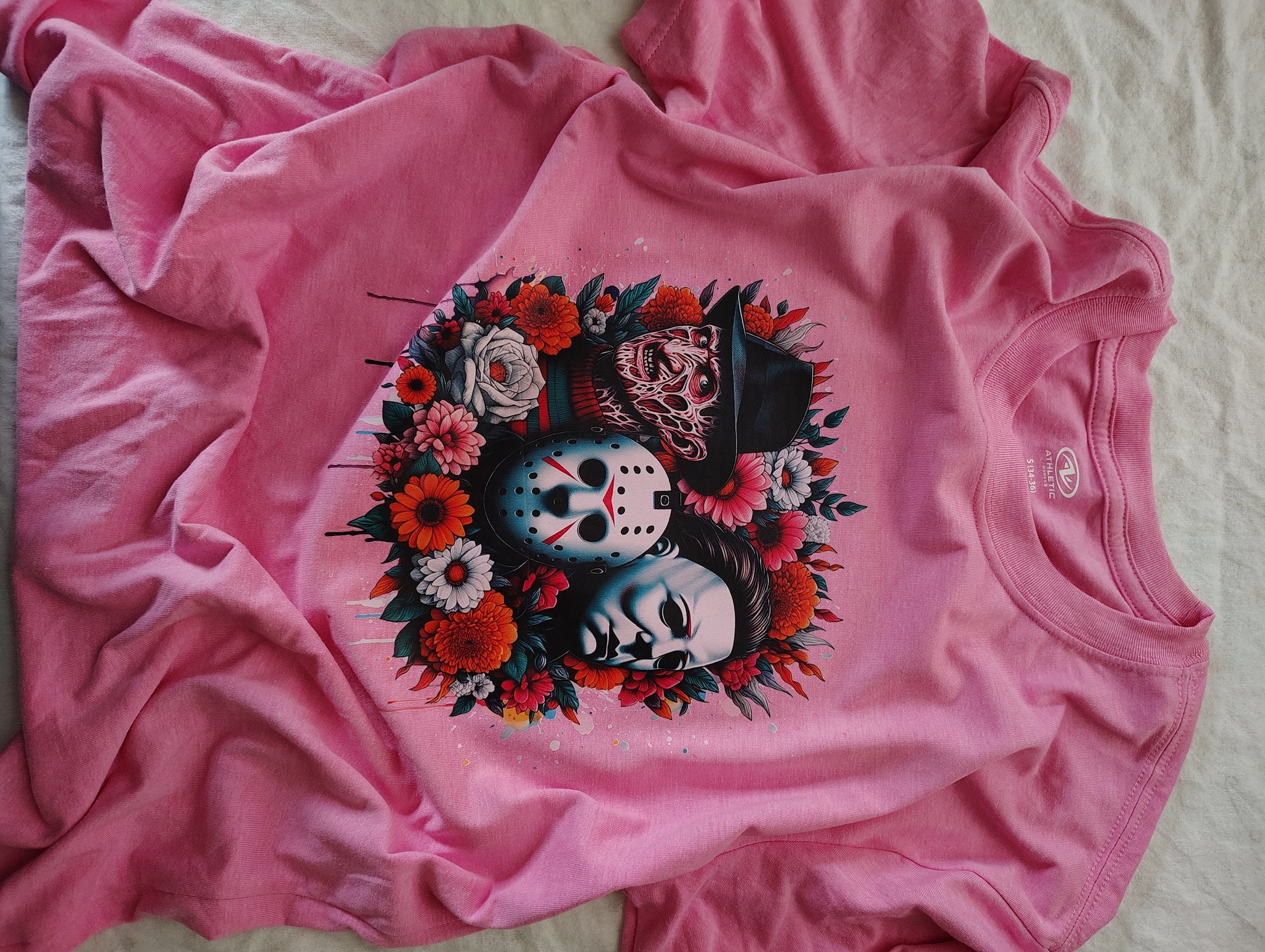 This is a pink shirt with horror guys on it. It is a size MEDIUM. This is perfect for fall/Halloween.