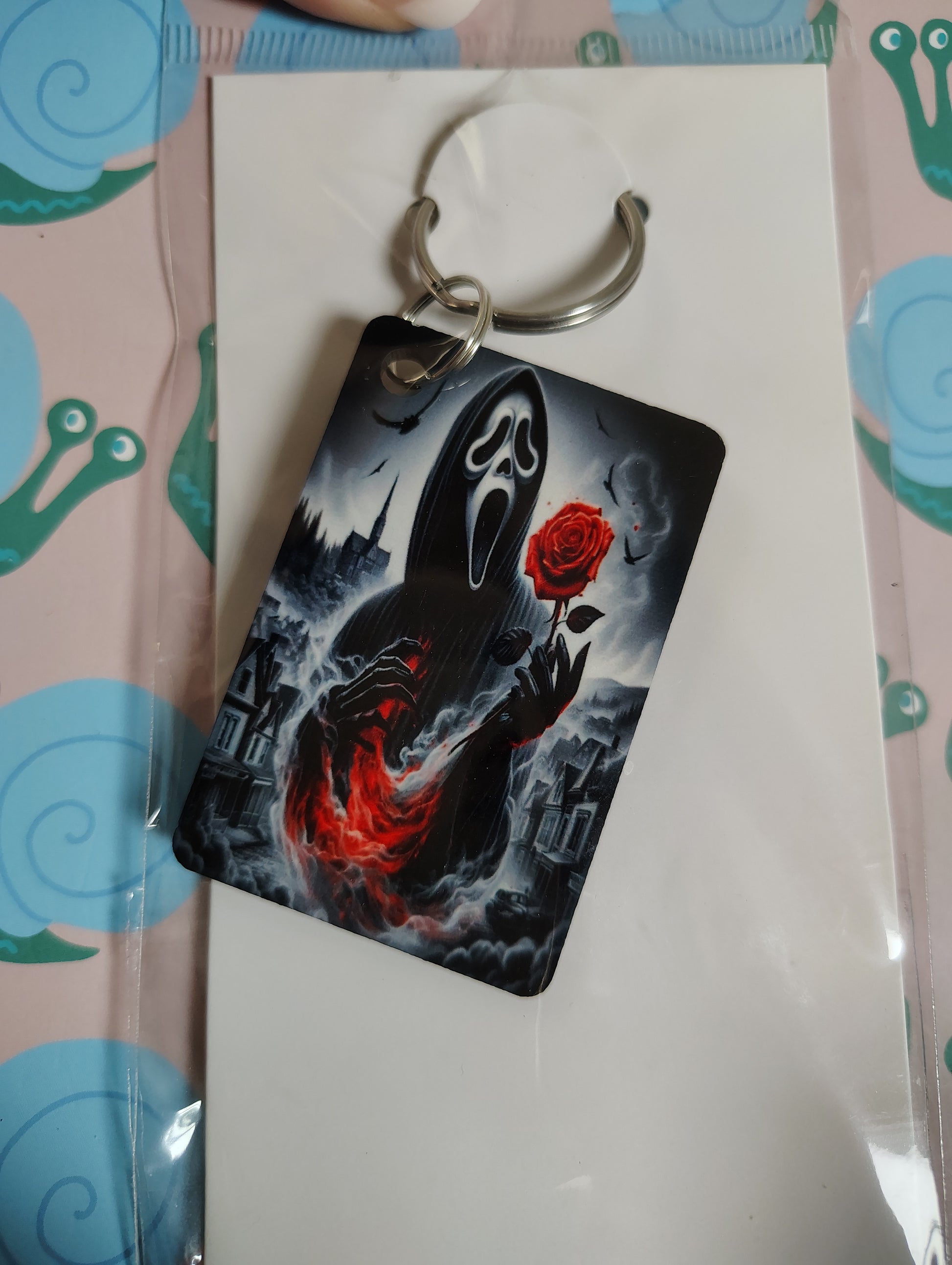 This is a beautiful scary guy with a rose. Double sided keychain.