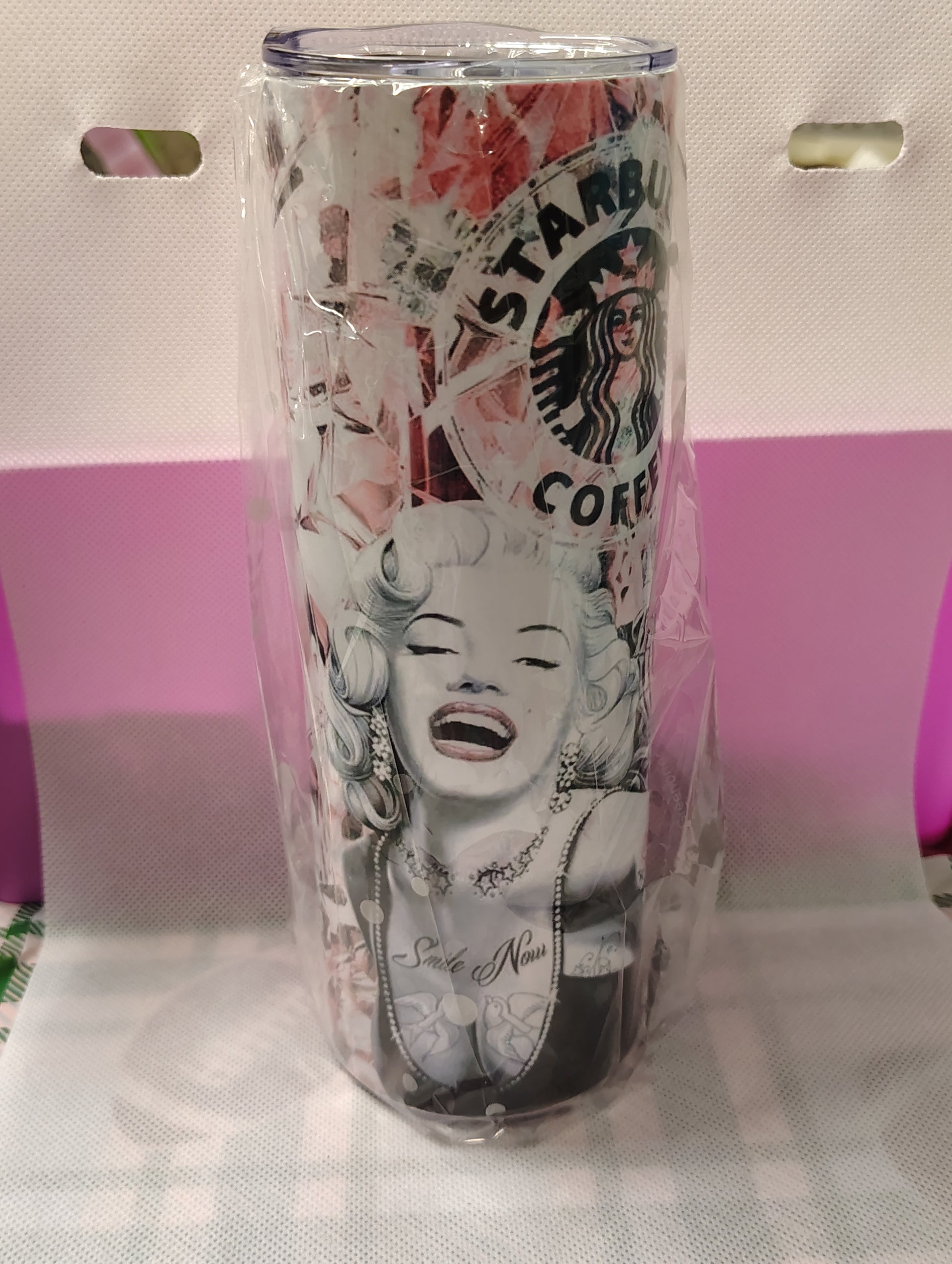 This is a beautiful pink and gray 20oz insulated stainless steel tumbler with a blond headed women. This tumbler will hold HOT and COLD drinks.